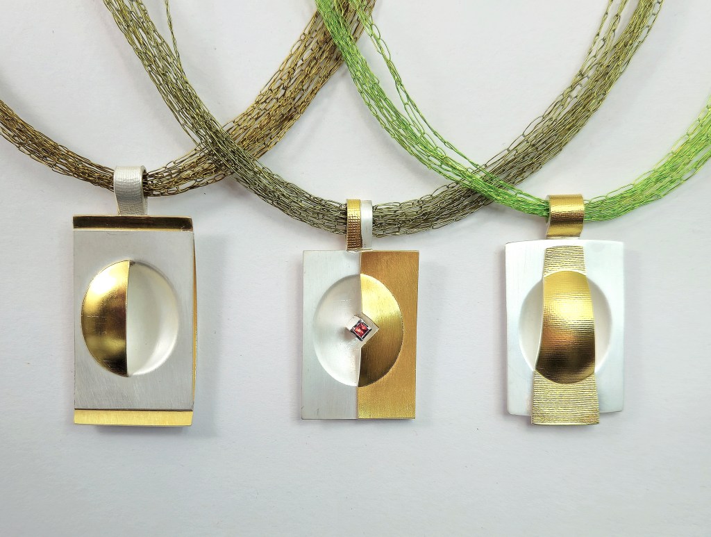 Seit vielen Jahren kenne ich den Kieler Holzbildhauer Giotto Bente und erlebe seine künstlerische Entwicklung mit. In einer seiner letzten Ausstellungen sah ich eine neue Skulptur, die er aus einer Holzschale, die ursprünglich in einer Bäckerei genutzt wurde, erschuf. Das fand ich sehr spannend und so entstanden diese drei Schmuckstücke aus Silber, Gold , Saphir und Kupferfäden.