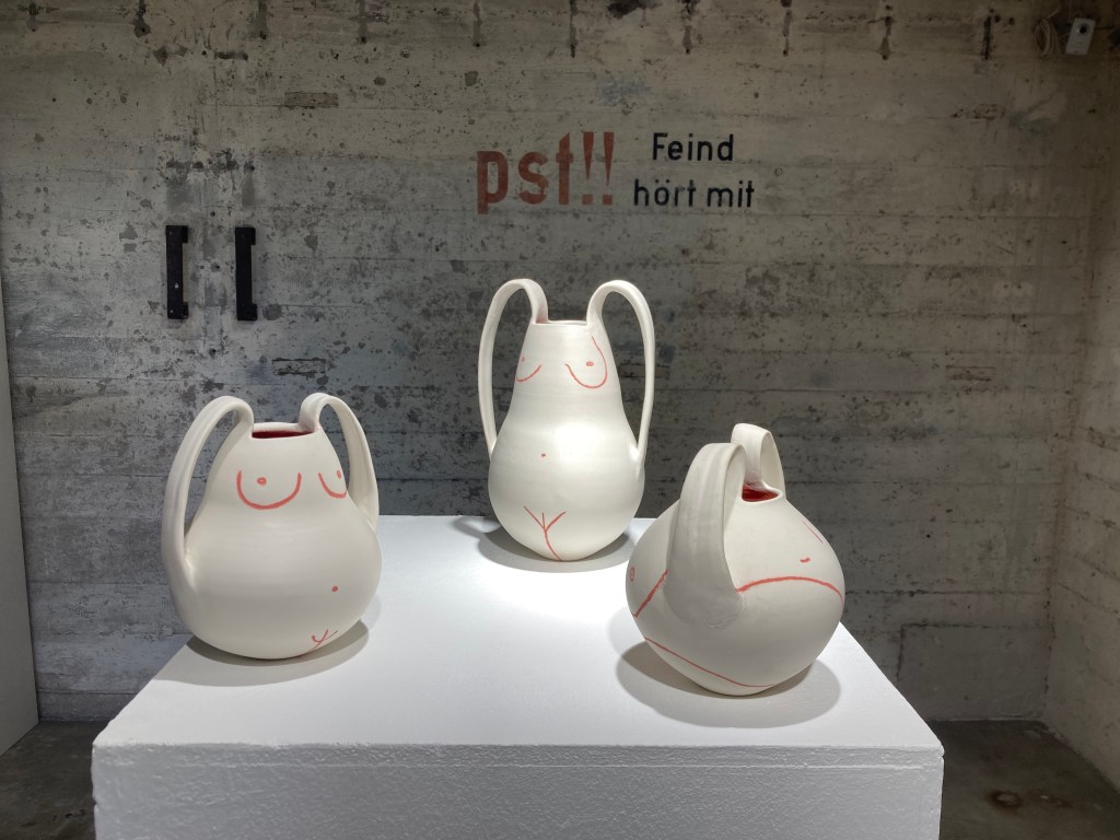 Eva Koj entwarf Schlaufenhenkelvasen, drehte sie in Porzellan und übergab sie mir in getrocknetem Zustand. Mich inspirierten sie zur Darstellung von Frauenkörpern, die ich mit einfachen Linien in das ungebrannte Porzellan einritzte. Mit dem Titel: “Urteil des Paris“ schlagen wir den Bogen zur Kunstgeschichte und seinen antiken Vorbildern.