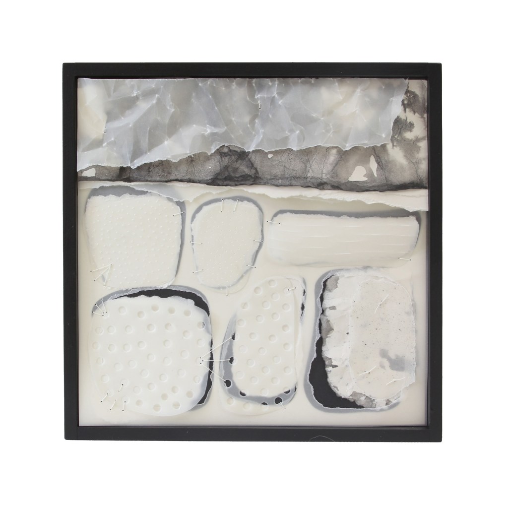 Objekte 4 – 6: Verschiedene Papierqualitäten in unterschiedlicher Bearbeitung und plastisch montiert, integrierter Fotodruck, bemaltes und gefärbtes Papier.Bearbeitung: Das Papier wurde gerissen, geschnitten, gestaucht, gerillt, gelocht, geknittert, geglättet, nass verformt, gefärbt, bemalt, vernäht, zusammen gefügt,…