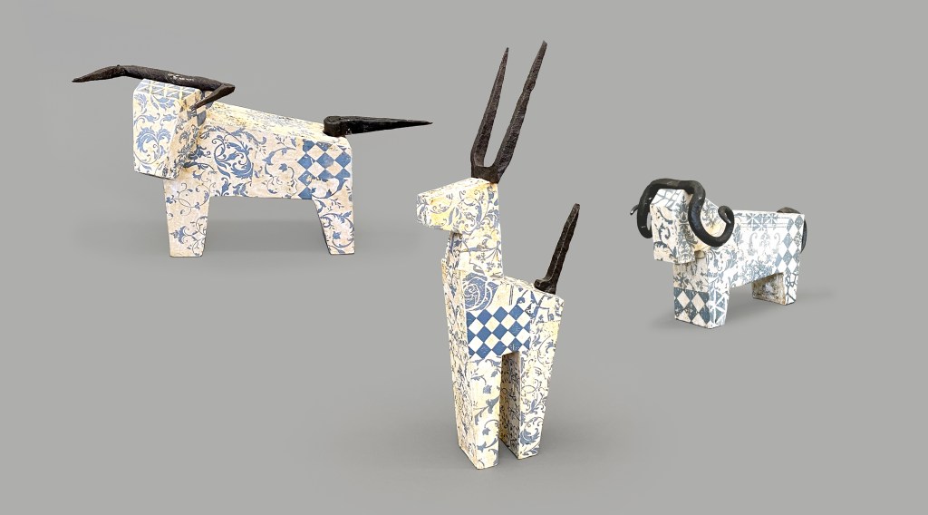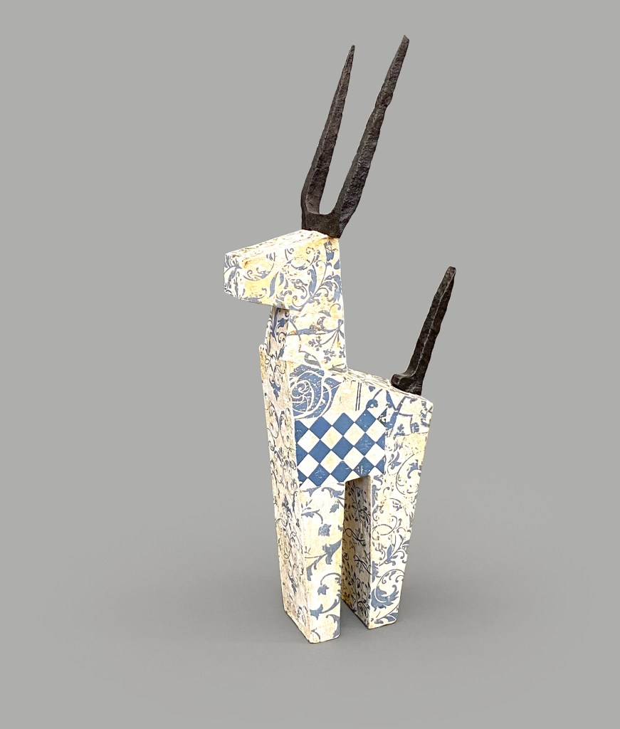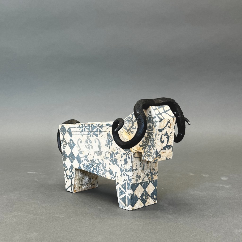 „Widder / Stier / Antilope“, Keramik/Steinzeug mit siebgedruckten Motiven und antikes, geschmiedetes Eisen.